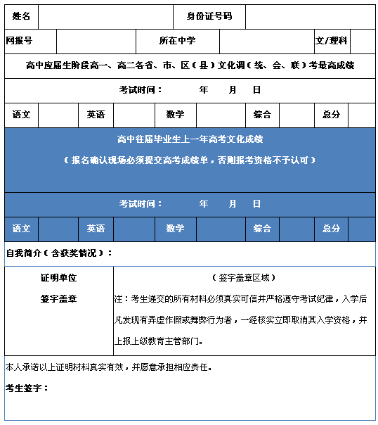 3、考生遞交的所有材料必須真實(shí)可信并嚴(yán)格遵守考試紀(jì)律,入學(xué)后凡發(fā)現(xiàn)有弄虛作假或舞弊行為者,一經(jīng)核實(shí)立即取消其入學(xué)資格,并上報(bào)上級(jí)教育主管部門。