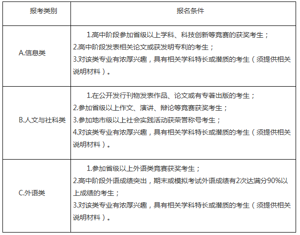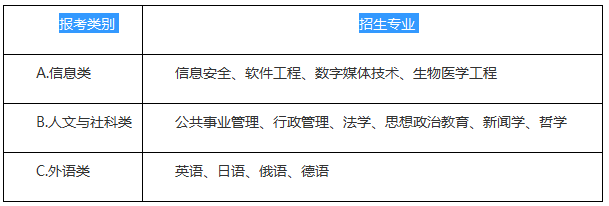 信息類招生專業(yè)限理工類考生報(bào)考,人文與社科類、外語類招生專業(yè)限文史類考生報(bào)考??忌蛇x擇信息類、人文與社科類、外語類其中一類報(bào)名,不得兼報(bào)。