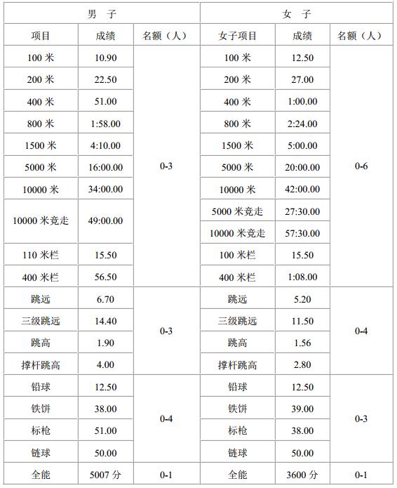 3.具備下列①、②條件之一,報考田徑項目的考生專項成績須達到我校報名標(biāo)準(zhǔn)(見附表):