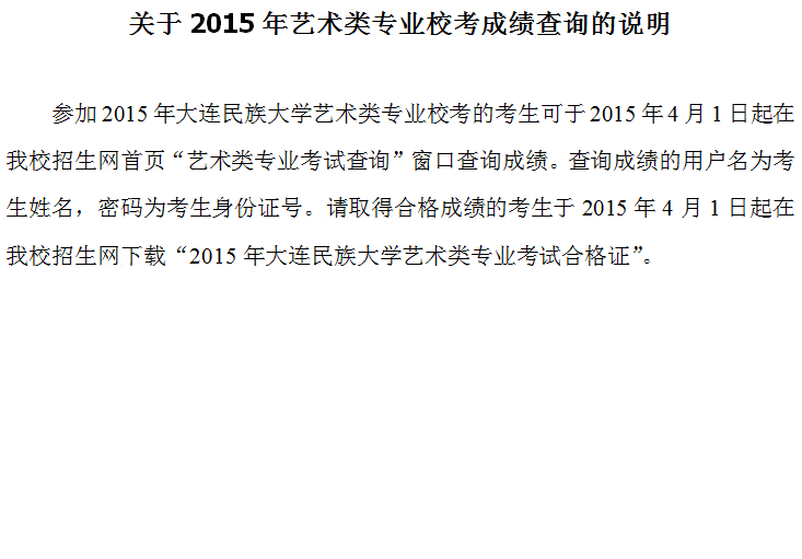 2015年大連民族大學藝術(shù)類專業(yè)考試查詢 點擊查詢