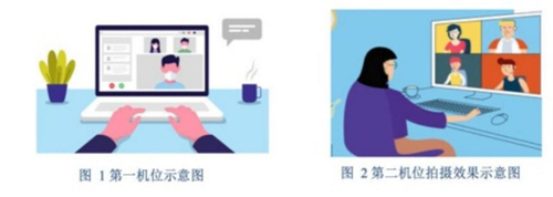 4.考生需要準(zhǔn)備可以支撐“雙機(jī)位”運(yùn)行的硬件,即需要兩部帶攝像頭及收音麥克風(fēng)的硬件設(shè)備及相應(yīng)附件,第一機(jī)位可以是電腦或手機(jī),第二機(jī)位只能為手機(jī)(建議第一機(jī)位首選有線網(wǎng)+電腦)。遠(yuǎn)程面試開始后,考生需首先掃碼接通二機(jī)位,并將第二機(jī)位的攝像頭360度環(huán)顧四周,以確保面試環(huán)境符合要求。第一機(jī)位設(shè)備應(yīng)從考生正面拍攝,放置在考生面部正前方約30cm處;第二機(jī)位設(shè)備應(yīng)從考生右后方45°距離考生約30cm處拍攝,確保第一機(jī)位能夠清晰拍攝考生上半身畫面,第二機(jī)位能夠清晰拍攝考生上半身及書桌桌面,面試過程中考生應(yīng)將雙手放置于書桌桌面,考官能夠從第二機(jī)位清晰看到第一機(jī)位屏幕。效果圖如下: