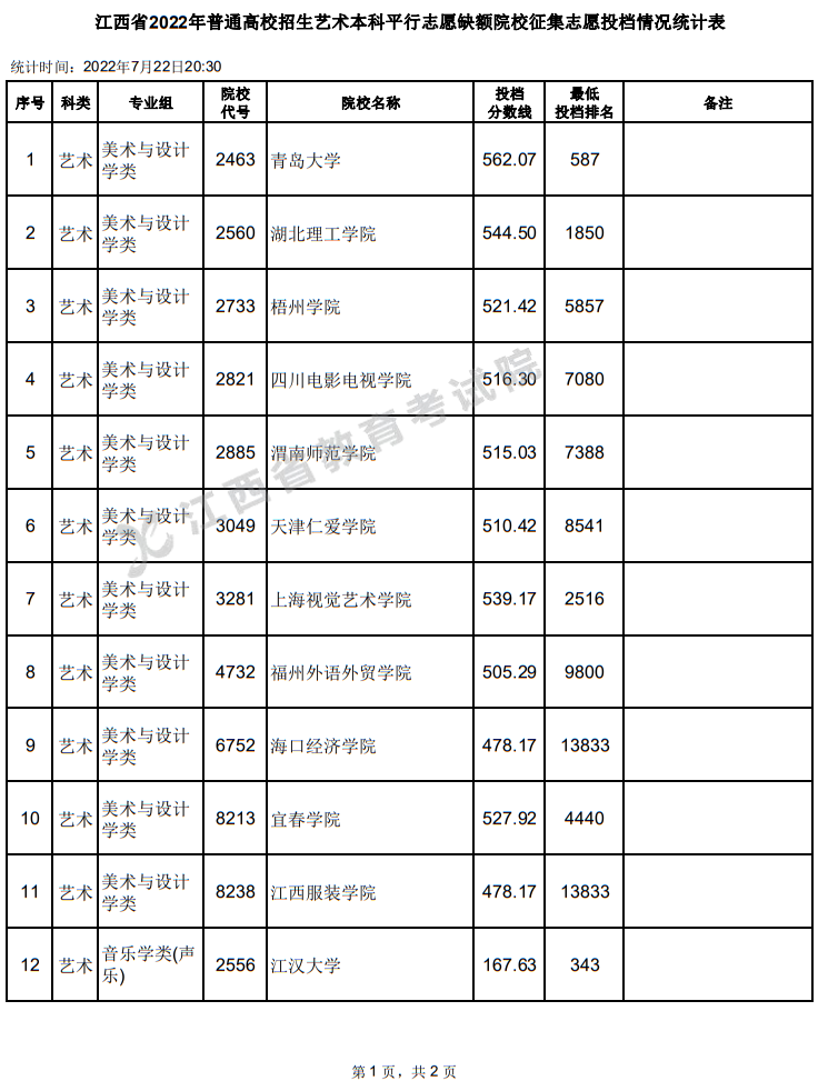 現(xiàn)將“江西省2022年普通高校招生藝術(shù)本科平行志愿缺額院校征集志愿投檔情況統(tǒng)計(jì)表”予以公布,點(diǎn)擊下面附件下載查閱。