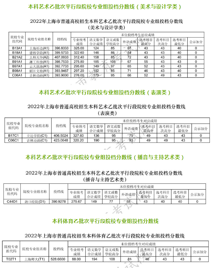 2022年上海市普通高校招生本科藝術(shù)、體育乙批次平行段院校專業(yè)組投檔線公布,如圖。