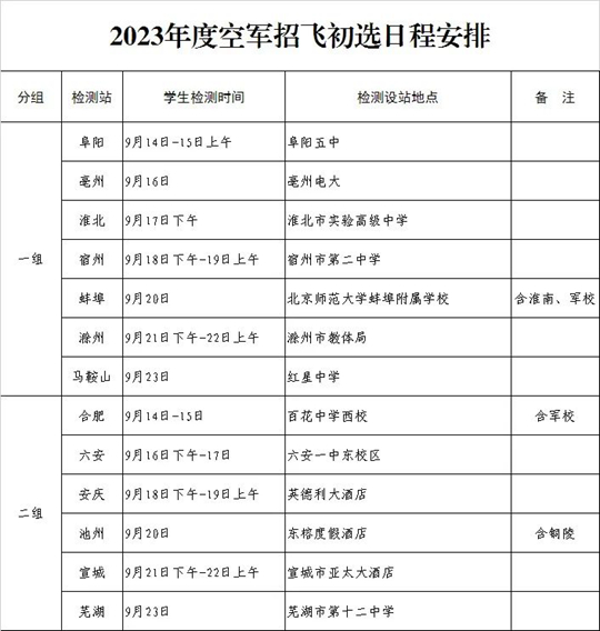 根據(jù)2023年度空軍招飛工作安排,9月14日至9月23日,空軍招飛局南京選拔中心將派初選組赴各地市,對報考空軍飛行學(xué)員的學(xué)生進(jìn)行檢測。