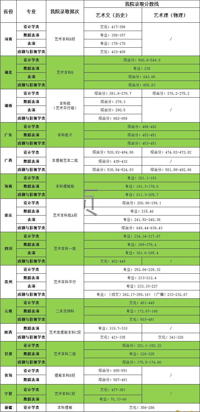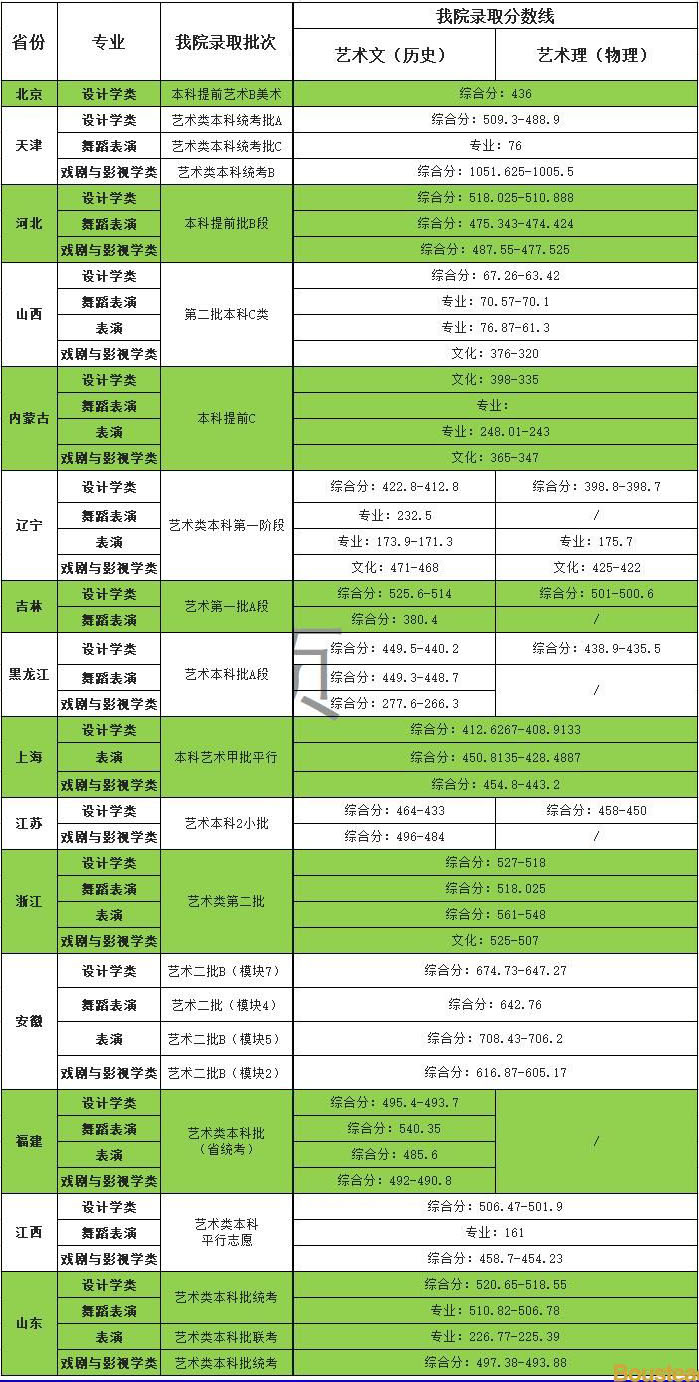 1.設計學類、戲劇影視文學和廣播電視編導專業(yè)根據分省招生計劃,在順序志愿投檔省份,或考生所在省(區(qū)、市)無明確(或不唯一)的投檔成績計算辦法,按文化課成績由高到低錄取。文化課成績相同時,優(yōu)先錄取省級專業(yè)統(tǒng)考成績較高的考生。如文化課和專業(yè)課成績均相同,則依次比較語文、數學、外語單科成績。在平行志愿投檔省份,以考生所在地教育招生主管部門設定投檔原則為準。當錄取原則與生源所在省(區(qū)、市)政策沖突時,執(zhí)行生源所在省(區(qū)、市)規(guī)定。