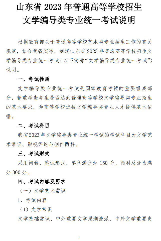 1、山東省2023年普通高等學(xué)校招生文學(xué)編導(dǎo)類專業(yè)統(tǒng)一考試說明 點(diǎn)擊下載