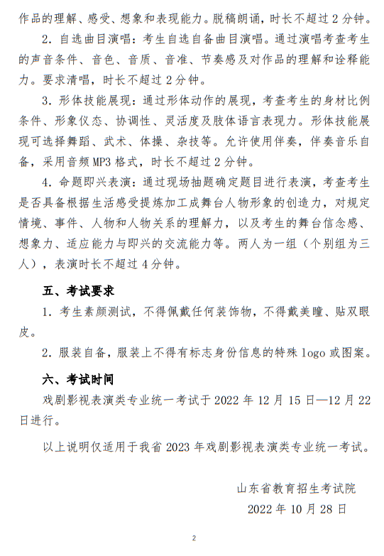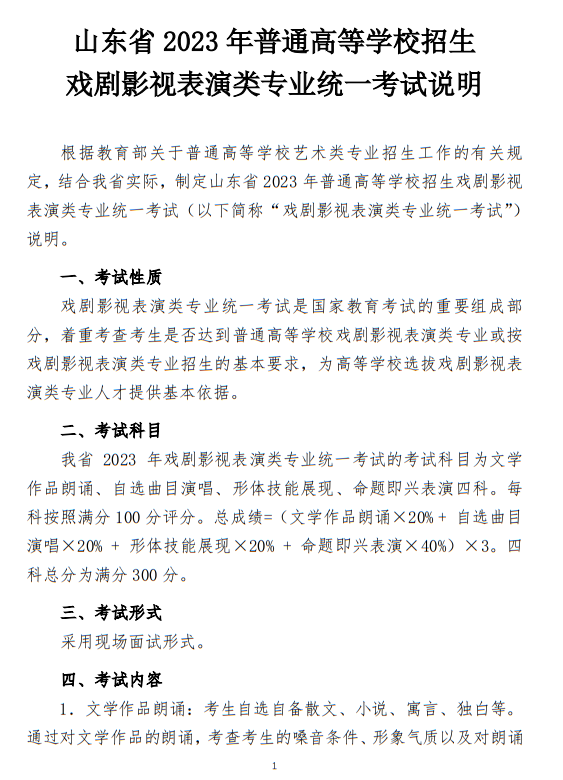 山東省2023年普通高等學(xué)校招生戲劇影視表演類專業(yè)統(tǒng)一考試說明 點擊下載