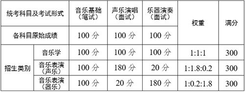 設(shè)音樂(lè)類(lèi)、美術(shù)學(xué)類(lèi)與設(shè)計(jì)學(xué)類(lèi)、舞蹈類(lèi)、播音與主持、體育舞蹈、廣播電視編導(dǎo)、書(shū)法學(xué)7個(gè)統(tǒng)考專(zhuān)業(yè)類(lèi)別。其中參加音樂(lè)類(lèi)統(tǒng)考的考生考試后根據(jù)各考試科目賦權(quán)分別獲得音樂(lè)學(xué)成績(jī)、音樂(lè)表演(聲樂(lè))成績(jī)、音樂(lè)表演(器樂(lè))成績(jī),賦權(quán)表如下: