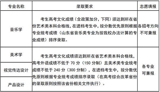 2023年我校藝術(shù)類各專業(yè)全部使用各省統(tǒng)考成績(jī)錄取(山東省音樂(lè)類專業(yè)為按我校重新計(jì)算的專業(yè)成績(jī)),不再單獨(dú)組織專業(yè)??迹唧w錄取要求如下。