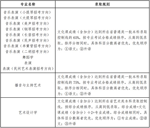 ?、倨叫兄驹竿稒n批次,對(duì)符合招生所在地區(qū)投檔條件,且符合我校錄取規(guī)則中文化課成績(jī)要求(詳見(jiàn)下表中“錄取規(guī)則”)的考生,按招生所在地政策錄取。