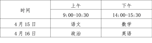 文化課統(tǒng)一考試科目為語(yǔ)文、數(shù)學(xué)、政治、英語(yǔ)4科,每科滿分為150分,考試時(shí)間安排為: