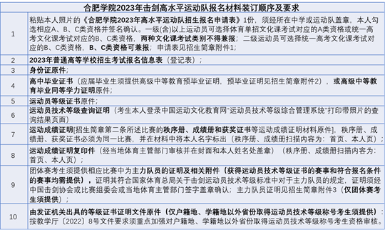 符合我校報名條件的所有考生,須提供按以下材料清單提供原件,同時將原件掃描后按目錄順序編號制成1個PDF文檔,并命名為“生源省份+運動員姓名+統(tǒng)一高考考生號+合肥學院擊劍高水平運動隊報名材料”(例:安徽省張**2334***合肥學院擊劍高水平運動隊報名材料):