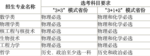 1.招生專業(yè):數(shù)學(xué)類、物理學(xué)類、生物技術(shù)、哲學(xué)、核工程與核技術(shù)、工程力學(xué)。在非高考綜合改革省份,哲學(xué)專業(yè)招收文科生,其他專業(yè)招收理科生。對實行高考綜合改革省份的考生,選考科目須滿足以下要求: