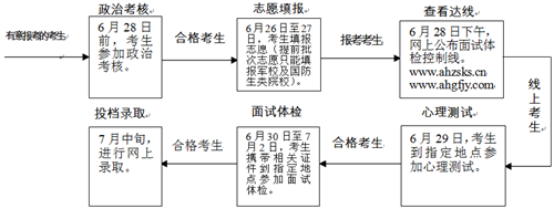 第三步.公布劃線。6月28日下午,在“安徽招生考試網(wǎng)”(www.ahzsks.cn)和“中安國(guó)防網(wǎng)”(www.ahgfjy.com),公布參檢分?jǐn)?shù)線、心理測(cè)試和面試體檢地點(diǎn),考生自行上網(wǎng)查看。