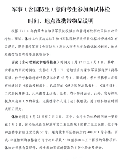 內(nèi)蒙古:軍事(含國(guó)防生)意向考生參加面試體檢時(shí)間、地點(diǎn)及攜帶物品說(shuō)明