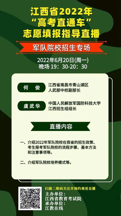 為進一步解讀軍校招生政策,指導考生科學填報軍校志愿,江西省教育考試院特別邀請江西省南昌市青山湖區(qū)人武部中校副部長何俊和中國人民解放軍國防科技大學江西招生組組長虞武華做客2022年“高考直通車”志愿填報指導直播間,為考生答疑解惑。