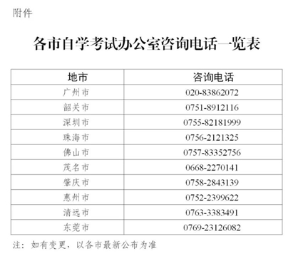 (三)報考過程中遇到的問題直接向當?shù)刈詫W考試辦公室咨詢(詳見附件)。其他未盡事宜,請考生密切關(guān)注廣東省教育考試院官方微信(微信號:gdsksy)和網(wǎng)站(網(wǎng)址:http://eea.gd.gov.cn)及各地自學考試辦公室發(fā)布的相關(guān)信息。