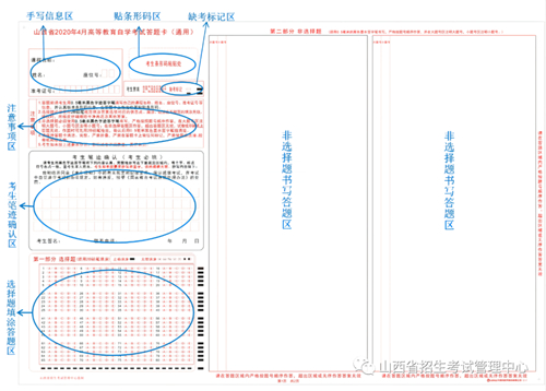 答題卡卡面包括手寫信息區(qū);貼條形碼區(qū);缺考標(biāo)記區(qū);注意事項區(qū);考生筆跡確認(rèn)區(qū);選擇題填涂答題區(qū);非選擇題書寫答題區(qū)等部分。樣卡如下: